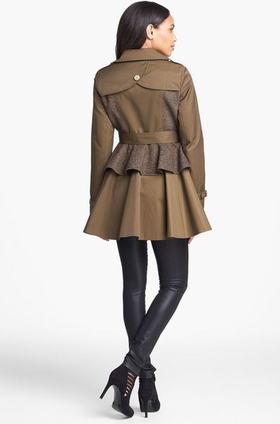 Image Name: Steve Madden Tweed Panel Peplum Trench Coat in Khaki (Olive) | Lyst
